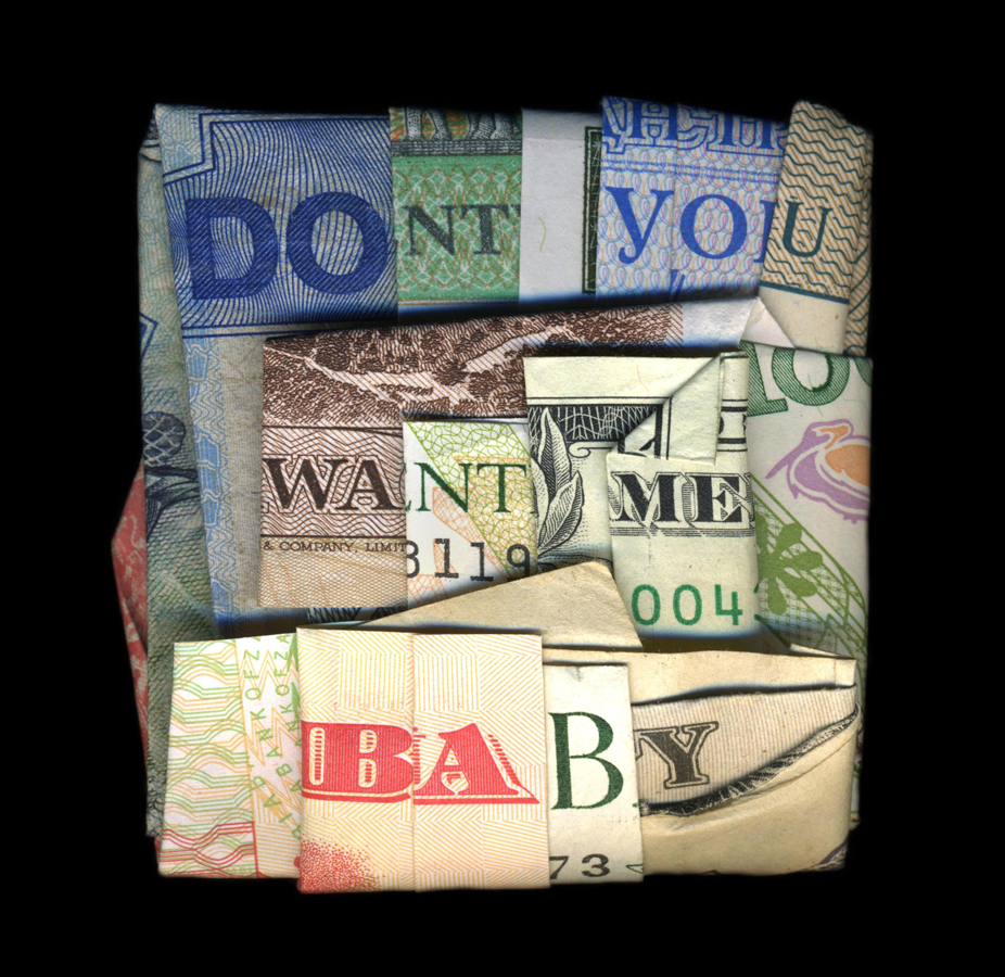 In “Global Currency”, his new series, Tague folds bills from several different countries. The diversity of colors and typography gave a new aesthetic to his work, with new notes and carefully folded, instead of crumpled. The formats got more square and less jagged, with phrases like “Can’t Buy Me Love” and “Don’t You Want Me Baby”, creating an innovative, humorous and ironic approach over the capitalist society.