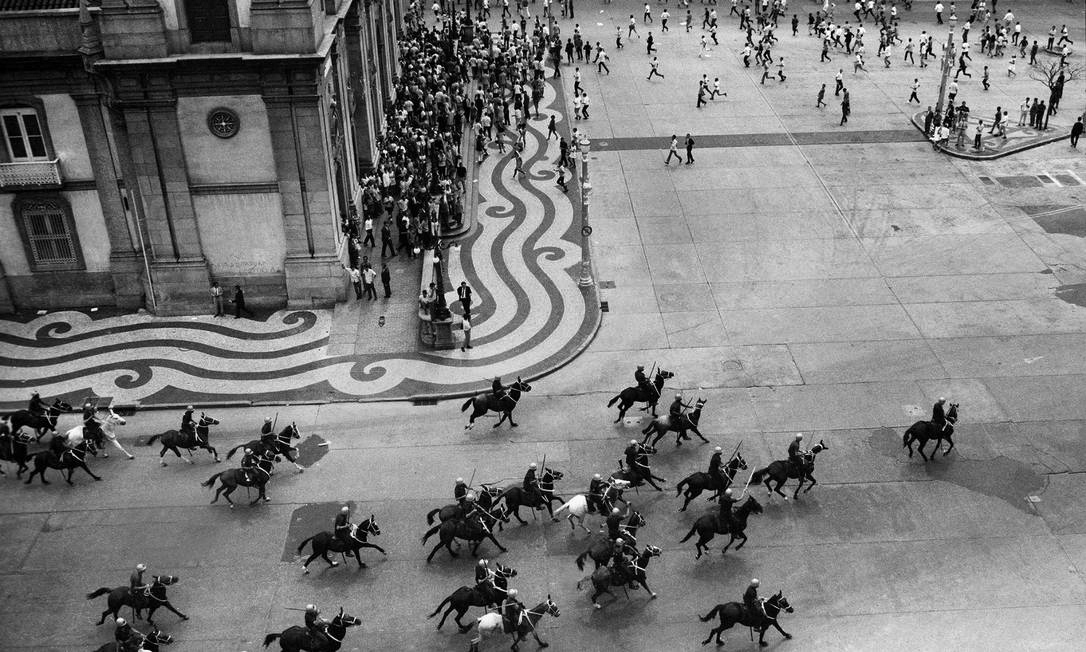 Outra foto que transforma história em arte, é a da cavalaria cercando a igreja da Candelária em 1968. Essa imagem, apesar de retratar um momento dramático, possui uma apurada composição visual, como bem descreve o escritor Ruy Castro: “O galope dos policiais a cavalo sobre os estudantes, com o desenho das pedras portuguesas em volta da igreja, dando aquele tremendo movimento e dramaticidade a cena.”